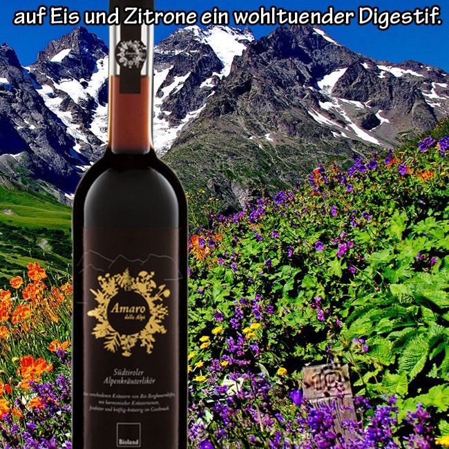 Sieben Kräuter von Südtiroler Bio Bergbauernhöfen geben dem Amaro delle Alpi seine harmonisch, frische Kräuterteenote. Feine Gewürze, kräftige Wurzeln und erfrischende Orangenschalen erweitern das Aromenspektrum um Noten von Lakritz, Eukalyptus und Lavendel und schaffen ein kräftig-kräutriges, balsamisches Mundgefühl. Pur, oder auf Eis und Zitrone ein wohltuender Digestif für Zuhause und die BioBar